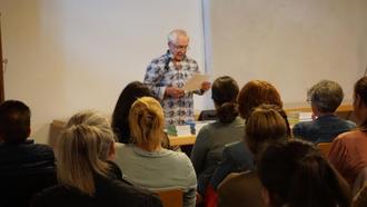 Der diesjährige Autor kommt aus Hainfeld und ist Sohn des Heimatschreibers Viktor Carl. Damit ist ihm das Schreiben quasi schon in die Wiege gelegt worden. Als passionierter Mountainbike ist er viel im Pfälzerwald unterwegs. Dort findet er Ort und Handlung, die ihn zu seinen schriftstellerischen Morden inspirieren. Kriminalistischen Gespür, die Liebe zu seiner Heimat und sprühender Witz zeichnen seine Bücher aus. Er liest im ersten Teil des Abends aus seinem vierter Krimi der „Teufelsberg-Leiche“. Darin begibt sich Kommissar Karl Kerner auf Spurensuche in einer Dorfkneipe. Mit den, zum Teil nicht mehr ganz nüchternen Gästen liefert er sich schnelle Dialoge im Pfälzer Dialekt. Pointierte Wortgefechte mit seinem Team tragen die Ermittlungen. Bis zur Pause ist der Mord zwar noch nicht geklärt, das gutgelaunte Publikum aber bereit für eine kleine Erfrischung. Dafür sorgte der Kulturverein mit kühlen Getränken und belegten Scheiben von frisch gebackenen Brot aus dem „hauseigenen“ Brotbackofen.