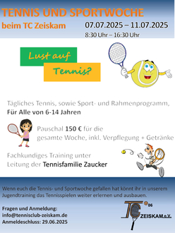 Inzwischen ist die Tennis und Sportwoche ein fester Bestandteil unseres Jahreskalenders geworden. Auch dieses Jahr wird sie wieder im gewohnten Rahmen stattfinden. Das Team des TC Zeiskam bietet unter der bewährten Leitung unseres Trainers Philipp Zaucker Tennis, Spiel, Spaß und Bewegung mit vielen Aktivitäten. Das abwechslungsreiche Programm wird durch entsprechende Verpflegung mit Frühstück und Mittagessen ergänzt. Vom Anfänger bis zum Tennisfortgeschrittenen ist für jeden sicher etwas dabei.