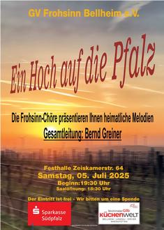 Unter dem Motto: „Ein Hoch auf die Pfalz“, veranstaltet der Gesangverein Frohsinn am Samstag, 07. Juli 2025, 19:30 Uhr, in der Festhalle an der Zeiskamer Straße, einen Liederabend, zu dem die Bevölkerung eingeladen ist.