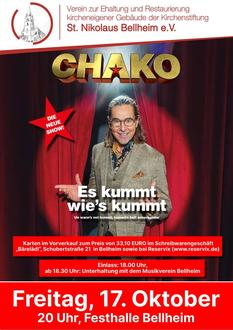 Dabei präsentiert Chako bei einer Vorpremiere sein brandneues Solo-Programm „Die neue Show! Es kummt wie’s kummt – Un wann’s net kummt, kummt’s halt annerschder.“