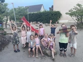 Nachdem die Eltern gegangen waren, begannen wir unseren Abend mit einer Schatzsuche im ganzen Dorf. Zuerst ging es zum Spielplatz, dann zum Storchennest, danach zur Fuchsbachhalle und zur Prot. Kirche, anschließend zum Kerweplatz und wieder zurück zur KiTa. An jeder Station fanden die Kinder kleine Briefe, auf denen Aufgaben standen, die die Kinder mit Bravour meisterten. Voller Freude und ganz stolz fanden sie dann auch die Schatzkiste, in der für jeden eine kleine Überraschung enthalten war.