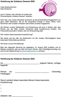 Bitte den folgenden Abschnitt bis spätestens 10. August 2025 ausfüllen und im Rathaus einwerfen oder per Mail (mit Ihrem Namen, dem Preisträgervorschlag und einer kurzen Begründung) an gemeinde@zeiskam.de schicken.