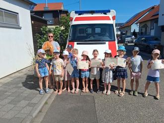 Der Höhepunkt des Erste Hilfe Kurses war dann der Besuch des Krankenwagens. Die Kinder durften in den Krankenwagen gehen und waren sehr erstaunt, was es dort alles gibt. Jedem Kind wurde der Blutdruck gemessen und jedes Kind durfte auch einmal auf der Liege liegen und angeschnallt werden.