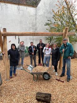 In mehreren Arbeitseinsätzen wurde zunächst die alte Schaukel abgebaut. Anschließend wurden neue Fundamente gegossen, um eine stabile Basis für die neue Schaukel zu schaffen. Danach erfolgte der Aufbau der neuen Schaukel, die nun das Außengelände der Kita bereichert. Zum Abschluss wurde der Fallschutz rund um die Schaukel sowie im gesamten Außengelände mit frischen Hackschnitzeln aufgefüllt, um die Sicherheit der Kinder beim Spielen zu gewährleisten.