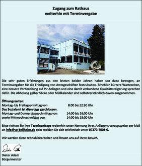 Bitte richten Sie Ihre Terminanfrage weiterhin unter Nennung Ihres Anliegens vorzugsweise per Mail an info@vg-bellheim.de oder melden Sie sich telefonisch unter 07272-7008-0.
