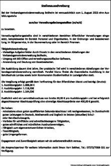 Bei der Verbandsgemeindeverwaltung Bellheim ist voraussichtlich zum 1. August 2023 eine Ausbildungsstelle