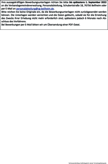 Ihre aussagekräftigen Bewerbungsunterlagen richten Sie bitte bis spätestens 1. September 2022 an die Verbandsgemeindeverwaltung, Personalabteilung, Schubertstraße 18, 76756 Bellheim oder per E-Mail an personalabteilung@vg-bellheim.de.