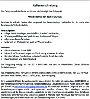 Ihre aussagekräftigen Bewerbungsunterlagen richten Sie bitte bis spätestens 20.09.2022 an die Verbandsgemeindeverwaltung, Personalabteilung, Schubertstraße 18, 76756 Bellheim oder per E-Mail an personalabteilung@vg-bellheim.de. Bitte reichen Sie keine Originale ein, da die Bewerbungsunterlagen nicht zurückgesendet werden können. Die Unterlagen werden vernichtet und die Daten gelöscht, sobald sie für die Erreichung des Zweckes ihrer Erhebung nicht mehr erforderlich sind; spätestens jedoch 6 Monate nach Abschluss des Verfahrens. Bei Bewerbungen per E-Mail bitten wir um Übersendung einer PDF-Datei.