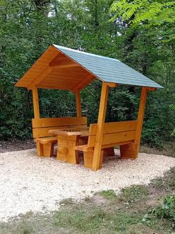Die Kosten von 1.400 Euro für das Material zum Bau einer witterungsgeschützten Sitzgruppe wurden als Bürgerprojekt zu 100% durch LEADER gefördert. In vielen ehrenamtlichen Stunden fertigte Arno Kern, Mitglied des PWV, daraus den Bausatz einer kleinen Hütte mit Tisch und Bänken. Unterstützt durch weitere Mitgliedern des PWV wurde inzwischen die neue „Laubhütte am PWV-Stein“, so der offizielle Name, im Bellheimer Wald östlich des S-Bahnhofs „Am Mühlbuckel“ fertig gestellt.