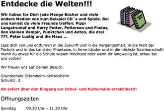 Wir haben für Dich jede Menge Bücher und viele andere Medien wie zum Beispiel CD´s und Spiele. Bei uns kannst du viele Freunde treffen: Pippi Langstrumpf und Harry Potter, Petterson und Findus, den kleinen Vampir, Pünktchen und Anton, die drei???, Peter Lustig und die Maus ...
