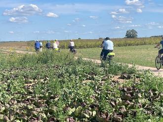 Von dort ging es über den Loschter Handkäsplatz mit kleinen informativen Stopps durch Feld und Wald weiter nach Zeiskam. Die nächste Genussadresse war "Im Häg" bei Schickes Lädel. Die Familie Schick ist mit ihren frischen Salaten und Gemüse aus eigenem Anbau ist ein, nicht ganz so geheimer Tipp für Menschen, die Qualität und Frische schätzen. Beliebt und bekannt sind neben der Hofvermarktung auch das Frühstück und die hausgemachten Kuchen. Im angeschlossenen Café bietet die Familie Schick donnerstags, freistags und samstagsmorgens einer wachsenden Fangemeinde aus nah und fern ein gastronomisches Angebot. Auch hier durften die Radler*innen probieren und konnten sich mit von der hohen Qualität der Produkte überzeugen.