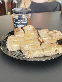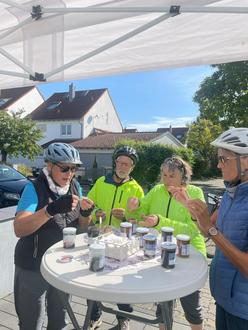 Mit Start in Bellheim ab S-Bahnhof "Am Mühlbuckel" folgten die Radler*innen in einer langen Reihe zur ersten Station. Im Hasenspiel wartete die Familie Martin/ Hellmann mit vorbereiteten Kostproben aus dem reichen Vorrat an Marmeladen, Soßen, und Eingewecktem. "Gudes Zeich" ist die Marke, unter denen sie ihre Produkte auf dem Deutsch-Französischen Bauern- und Genussmarkt (nächstes Jahr am Sonntag, 26.04.2026) und auch in den regionalen Supermärkten vermarkten. Die Teilnehmer*innen durften sich ein kleines Gläschen der Köstlichkeiten mitnehmen oder auch gerne aus dem Produktsortiment etwas kaufen.