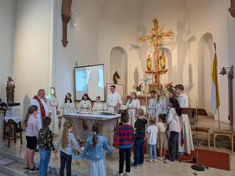 Ein besonders berührender Moment war das Vaterunser, als Pfarrer Buchert alle Kinder zum Altar bat. Hand in Hand standen Kinder, Messdiener/innen und Pfarrer gemeinsam mit der Gemeinde im Gebet vereint - ein Bild, das lange in Erinnerung bleiben wird.
