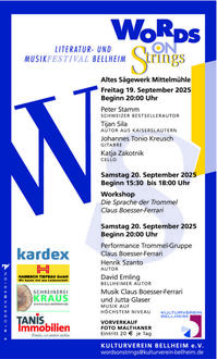 Der Kulturverein Bellheim startet am 19. und 20. September mit seiner neuen Veranstaltungsreihe „Words in Strings“, einem Literatur- und Musikfestival in Bellheim. Dieses besondere Festival soll künftig jedes Jahr am dritten Septemberwochenende stattfinden. Auf der Bühne werden regionale und überregionale Künstler und Künstlerinnen stehen. Zudem wird ein Workshop von Claus Boesser-Ferrari - „Die Sprache der Trommel“ - für alle Interessierten ab 12 Jahren möglich sein. Anmeldung zum Workshop wordsonstrings@kulturverein-bellheim.de