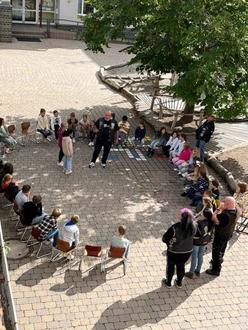 Der einsetzende Regen setzte dem Aufenthalt im Freien bald ein Ende und es folgte ein beeindruckendes Rollenspiel von Frank und Tina im Klassenraum der 4a. Was tun, wenn man von Unbekannten angesprochen oder gar festgehalten wird? Weglaufen, laut „Hilfe“ oder „Feuer“ schreien. Dass dies nicht aus Spaß gerufen wird und somit die Aufmerksamkeit der Umgebung weckt, war jedem Schüler klar. Gut gemerkt haben sie sich auch das sogenannte „stumme Zeichen“ - die Hand zur Faust geballt und darin den Daumen versteckt, als Zeichen der Hilfebedürftigkeit, wenn eine andere Verständigung nicht mehr möglich ist.