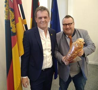 Um die offenen Projekte in die Realisierungsphase zu bringen, bedarf es neben viel Geduld vor allem Beharrlichkeit und Durchhaltevermögen. Gerald Job und Andy Becht versicherten einander, in Kontakt zu bleiben und betonen die gegenseitige vertrauensvolle Zusammenarbeit. Als Gastgeschenk überreichte Gerald Job einen Rollbraten, den ein ums leibliche Wohl des Staatssekretärs Becht im fernen Mainz besorgter Bürger mit auf die Reise geschickt hatte.