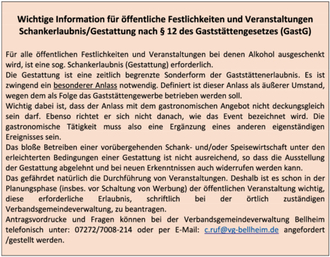 Für alle öffentlichen Festlichkeiten und Veranstaltungen bei denen Alkohol ausgeschenkt wird, ist eine sog. Schankerlaubnis (Gestattung) erforderlich.