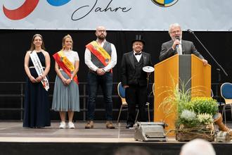 Dem Staatssekretär und Bellheimer Andy Becht war es eine Ehre, die Glückwünsche des Landes Rheinland-Pfalz in seinem Grußwort zu überbringen. Diesen schloss sich der 1. Kreisbeigeordnete Christoph Buttweiler in Vertretung von Landrat Dr. Fritz Brechtel für den Landkreis Germersheim an, der insbesondere die gute Zusammenarbeit mit den Gremien, Mitarbeiterinnen und Mitarbeitern sowie Bürgermeister Adam lobte und das ehrenamtliche Engagement der Einwohnerinnen und Einwohnern der Verbandsgemeinde Bellheim hervorhob. Ortsbürgermeister Paul Gärtner und der amtierende Lord, stellvertretend für die Hoheiten aus der Verbandsgemeinde, überbrachten die Glückwünsche der Ortsgemeinden.