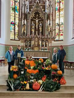 Fleißige Helferinnen waren zugange, um vor dem Zelebrationsaltar einen reichlich bestückten Gabentisch mit heimischen Früchten und Gemüse aufzubauen.