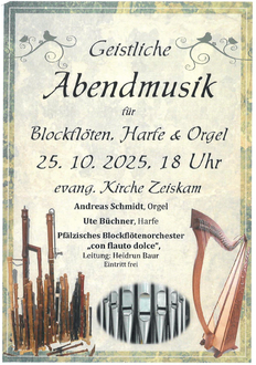 | 18:00 Uhr | Geistliche Abendmusik für Blockflöte, Harfe und Orgel mit dem pfälzischen Blockflötenorchester „con flauto dolce“ in der Prot. Kirche |