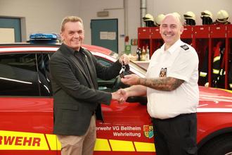 Am 15. Oktober 2025 überreichte Bürgermeister Gerald Job bei der feierlichen Übergabe in der Feuerwache Bellheim die Fahrzeugschlüssel an Wehrleiter Mirko Brunck. „Mit diesem neuen Kommandowagen investieren wir gezielt in moderne Einsatztechnik und stärken damit die Schlagkraft unserer Feuerwehr“