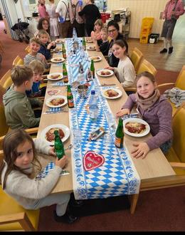 Im Speisesaal war schon alles bayerisch geschmückt, denn es war Oktoberfest. Mit Musikunterstützung von Edelweiß Toni konnte die Feier beginnen. Für die Kinder gab es ein extra Menü, und jedes Kind ließ sich seine Spaghetti mit Tomatensoße schmecken. Danach gab es noch ein leckeres Eis. Als alle gesättigt waren, ging die Feier erst richtig los: Die Bewohner begannen zu tanzen, und die Kinder konnten sich noch beim berühmten Nagelspiel messen (Nagel in den Baumstamm hämmern). Nach einem gelungenen Vormittag ging es kurz nach 13:30 Uhr wieder den Hort zurück. Natürlich durfte jedes Kind stolz seinen ausgehöhlten Kürbis mit nach Hause nehmen.