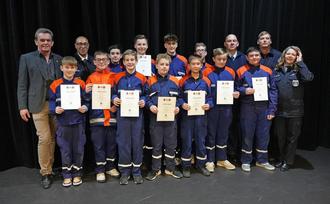 Die Jugendflamme ist ein Ausbildungsnachweis in Form eines Abzeichens für Jugendfeuerwehrmitglieder in Deutschland und wird in drei Stufen unterteilt. Bei der Jugendflamme Stufe 1 müssen unter anderem mindestens drei Knoten oder Stiche angefertigt und feuerwehrtechnische Fragen beantwortet werden. Dieses Jahr wurden erstmalig im Rahmen der Jahresdienstversammlung 11 Abzeichen der „Jugendflamme Stufe 1“ verliehen an: Nico Diete (B), Nils Espenhain (O), Tobias Göbel (B), Lukas Hauber (B), Laurin John (B), Tim Kempenich (K), Alexander Ortler (O), Malte Rings (O), Thore Rings (O), Randy Rubach (B), David Schmidt (B).