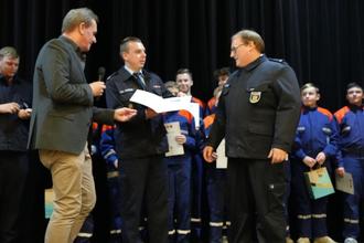 Eine besondere Ehrung erhielten mit der Verleihung des Ehrenzeichens in Bronze der Jugendfeuerwehr Rheinland-Pfalz Brandmeister Christoph Thomas (O) und Brandmeister Martin Stadel (O).