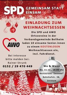 Wir benötigen Ihre Unterstützung: Wenn Sie Seniorinnen oder Senioren kennen, denen ein schöner Abend mit einem guten kostenlosen Essen im Kreise lieber Menschen aus den Ortsgemeinden der Verbandsgemeinde Bellheim guttun würde, dann sprechen Sie diese Menschen bitte an und ermutigen Sie diese Menschen, sich bitte bei uns zu melden oder erfragen Sie bitte, ob wir Kontakt aufnehmen dürfen. Eventuelle Fragen zu der Aktion beantwortet gerne der SPD-Ortsvereinsvorsitzende Rainer Strunk unter 0152 29470449 täglich ab 17:00 Uhr.