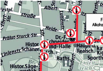 | Fortmühlstraße ab Schulstraße, Hammerstraße, Hintere Straße bis Mittelmühlstraße, Schulstraße bis Fortmühlstraße und die Schubertstraße bis Albert-Schweitzer-Straße laut beiliegendem Planauszug. An den Zugängen zu dem öffentlichen Bereich werden Hinweisschilder mit der Aufschrift „Faschingsumzug - Alkoholmitbringverbot“ angebracht. |