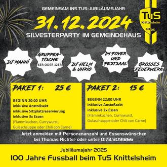Am 31.12. findet im Gemeindehaus die TuS-Silvesterparty statt, um gemeinsam in das Jubiläumsjahr 2025 zu starten.