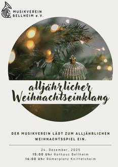 Der Musikverein Bellheim lädt Sie auch in diesem Jahr wieder ganz herzlich zu unserem alljährlichen Weihnachtseinklang ein. Wir freuen uns sehr Sie alle an Heiligabend in weihnachtliche Stimmung zu versetzen.