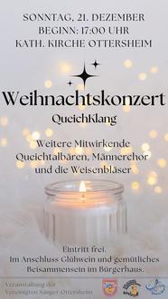 Der Chor QueichKlang lädt recht herzlich zum alljährlichen Weihnachtskonzert am Sonntag, den 21.12.2025, um 17:00 Uhr in die katholische Kirche Ottersheim ein. Gemeinsam mit dem Männerchor und dem Kinder- und Jugendchor -den Queichtalbären- lässt der Chor mit diesem Konzert sein Jubiläumsjahr ausklingen. Besonders erfreulich ist die Mitwirkung der Bläsergruppe der Kultuskapelle Offenbach -Mittwoch auf Nacht Buam-, die das Konzert mit festlichen Klängen und Weihnachtsliedern zum Mitsingen bereichern wird. Im Anschluss an das Konzert laden die Chöre zu Glühwein im Bürgerhaus ein.