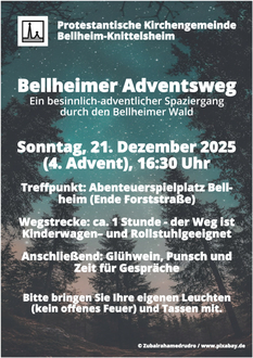| 16:30 Uhr | „Bellheimer Adventsweg“; Treffpunkt am Abenteuerspielplatz, von dort aus ca. 1-stündiger besinnlich-adventlicher Rundweg durch den Bellheimer Wald |