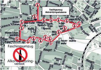| Fortmühlstraße ab Schulstraße, Hammerstraße, Hintere Straße bis Mittelmühlstraße, Schulstraße bis Fortmühlstraße und die Schubertstraße bis Albert-Schweitzer-Straße laut beiliegendem Planauszug. An den Zugängen zu dem öffentlichen Bereich werden Hinweisschilder mit der Aufschrift „Faschingsumzug - Alkoholmitbringverbot“ angebracht. | |
