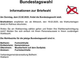 Briefwählern empfehlen wir, ab Mittwoch, den 19.02.2025, die Wahlunterlagen direkt im Rathaus abzuholen.