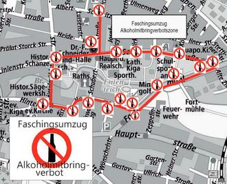 Nach dem Grundsatz der Verhältnismäßigkeit und zur Wahrung der Rechte der Gaststättenbetreiber konnte von einer Erstreckung des Ausschankverbotes auf konzessionierte Flächen und Ausschankstellen abgesehen werden. Aus Gründen der Verhältnismäßigkeit wurde das Alkoholverbot auch zeitlich und räumlich begrenzt, weil die beschriebenen Sicherheitsverstöße regelmäßig nur während des Fastnachtsumzuges, wo sich die Jugendlichen treffen und die Musik spielt, auftreten.