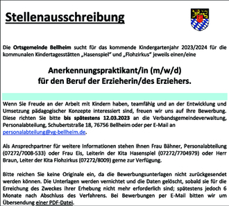 Wenn Sie Freude an der Arbeit mit Kindern haben, teamfähig und an der Entwicklung und Umsetzung pädagogischer Konzepte interessiert sind, freuen wir uns auf Ihre Bewerbung. Diese richten Sie bitte bis spätestens 12.03.2023 an die Verbandsgemeindeverwaltung, Personalabteilung, Schubertstraße 18, 76756 Bellheim oder per E-Mail an personalabteilung@vg-bellheim.de.