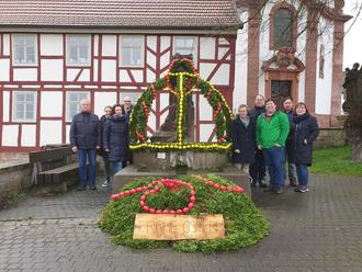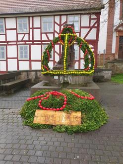 Bereits zum 2. Mal folgte man dieser aus der fränkischen Schweiz kommenden Tradition und schmückte den Brunnen vor der katholischen Kirche. In der letzten Märzwoche wurde das Gestell mit Buchs umwickelt und mit Eierketten geschmückt. Dies erledigten, unter der Leitung von Verena Wiegand Tanja Mähler, Carolin Scheffer und Birgit Schwab. Die Eierfarben Rot und Gelb erinnern an die Wappenfarbe unserer Gemeinde. Die Mitglieder des Ortsbeirates, die dieses Brauchtum letztes Jahr einführten, stellten das fertige Gestell wetterbedingt bereits am Freitag zwischen zwei Regenschauern feierlich auf.