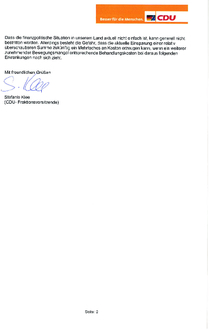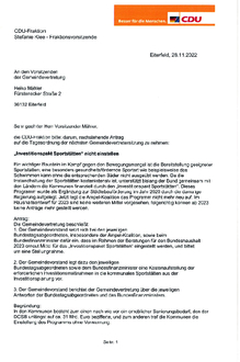 | Antrag der CDU-Fraktion vom 28.11.2022 Die Gemeindevertretung beschließt: 1. Der Gemeindevorstand setzt sich bei den jeweiligen Bundestagsabgeordneten, insbesondere der Ampel-Koalition, sowie beim Bundesfinanzminister dafür ein, dass im Rahmen der Beratungen für den Bundeshalt 2023 erneut Mittel für das "Investitionspaket Sportstätten" eingestellt werden und bittet um eine Stellungnahme. 2. Der Gemeindevorstand legt dazu den jeweiligen Bundestagsabgeordneten sowie dem Bundesfinanzminister eine Kostenaufstellung der erforderlichen Investitionsmaßnahmen in die kommunalen Sportstätten aus der Investitionsplanung vor. 3. Der Gemeindevorstand berichtet der Gemeindevertretung über die jeweiligen Antworten der Bundestagsabgeordneten und des Bundesfinanzministers. |
