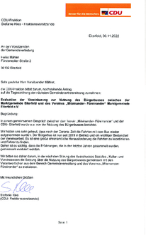 | Antrag der CDU-Fraktion vom 30.11.2022 Evaluation der Vereinbarung zur Nutzung des Bürgerbusses zwischen der Marktgemeinde Eiterfeld und dem Verein MITEINANDER-FÜREINANDER Marktgemeinde Eiterfeld e. V. |