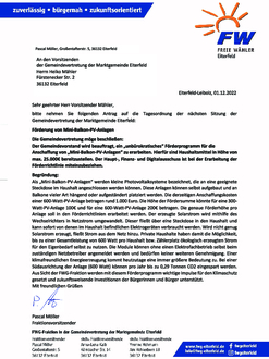 | Antrag der FWG-Fraktion vom 30.11.2022 Der Gemeindevorstand wird beauftragt, ein "unbürokratisches" Förderprogramm für die Anschaffung von "Mini-Balkon-PV-Anlagen" zu erarbeiten. Hierfür sind Haushaltsmittel in Höhe von maximal 25.000,00 € bereitzustellen. Der Haupt-, Finanz- und Digitalausschuss ist bei der Erarbeitung der Förderrichtlinie miteinzubeziehen. |