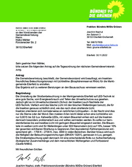| Antrag der Fraktion BÜNDNIS 90/DIE GRÜNEN vom 30.11.2022 Die Gemeindevertretung beschließt, der Gemeindevorstand wird beauftragt, ein insektenfreundliches Beleuchtungskonzept mit Lichtleitlinie (Biosphärenreservat Rhön) für die Marktgemeinde Eiterfeld zu erstellen. Das Ergebnis soll zu weiteren Beratungen an den Bau-, Planungs- und Umweltausschuss verwiesen werden. |