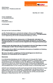 | Anfrage der CDU-Fraktion vom 29.11.2022 Welche baulichen Maßnahmen, insbesondere im Tiefbaubereich, sind seitens der Marktgemeinde Eiterfeld im Vorfeld des beabsichtigten Bau-beginns von Hessen Mobil vorab durchzuführen und wie weit sind die entsprechenden Planungen/Ausschreibungen hierfür? Inwieweit werden die Anlieger über den Planungsstand informiert? Sind diese im Vorfeld mit einbezogen worden? Ist eine Anliegerversammlung vorgesehen? Wird es seitens Hessen Mobil noch öffentliche Informationen hinsichtlich der Schaltung der Lichtsignalanlagen geben? Wie sehen die weiteren unmittelbaren Schritte der Marktgemeinde Eiterfeld aus (Gespräche mit Hessen Mobil und Planungsbüro)? |