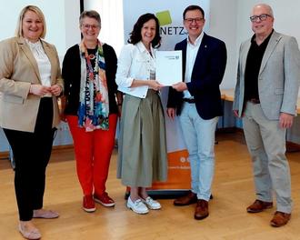 v.l.n.r.: Dana Hauke (Bürgermeisterin Marktgemeinde Eiterfeld), Brigitte Kram (1. Vorsitzende Kolpingwerk Diözesanverband Fulda e.V., Melanie Möller (Leitung FamilienNETZwerk Kolping), Frederik Schmitt (Erster Kreisbeigeordneter), Thomas Vogler (Geschäftsführer Kolpingwerk Diözesanverband Fulda e.V.)