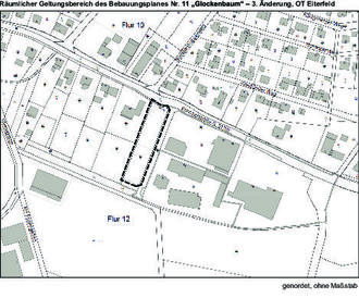 Die Gemeindevertretung der Marktgemeinde Eiterfeld hat in ihrer Sitzung am 16.12.2022 die Aufstellung des Bebauungsplanes Nr. 11 „Glockenbaum“ - 3. Änderung im beschleunigten Verfahren gemäß § 13a BauGB ohne Durchführung einer Umweltprüfung nach § 2 Abs. 4 BauGB beschlossen. Mit der 3. Änderung sollen im Bereich südlich der Bahnhofstraße (Landesstraße L 3170) auf dem Flurstück 63/3 westlich der hier angrenzenden Einzelhandelsnutzungen die bauplanungsrechtlichen Voraussetzungen für die städtebauliche Entwicklung und Bebauung einer bislang baulich nicht genutzten Fläche geschaffen werden. Der räumliche Geltungsbereich des Bebauungsplanes umfasst in der Gemarkung Eiterfeld, Flur 12, das Flurstück 63/3 teilweise und kann der nachfolgenden Übersichtskarte entnommen werden.