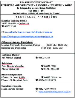 | Großentaft 19:00 Uhr | Hl. Messe für Sabine Fladung u. verst. Großeltern Fladung u. Neidhart / für Pfr. Albert Reinl / für Adelhard u. Anna Neidhart |