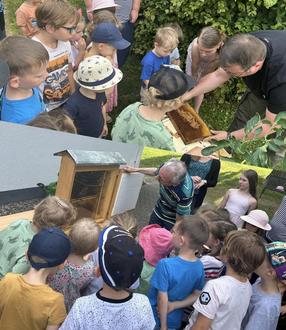 Das Leben der Biene und ihre Bedeutung für uns Menschen war im Juli Thema im Kindergarten Großentaft. Die Kinder sammelten Informationen zum Aussehen und Leben der Insekten, zu deren verschiedenen Arbeitsaufgaben und zur Wichtigkeit von Blumenwiesen. In Vorbereitung des Projektes säten die Kinder Wiesenblumensamen in zwei Mini-Hochbeeten aus. Hier lassen sich jetzt viele Insekten beobachten. Zum Abschluss des Projektes besuchten uns Herr Paul Werner und Herr Christoph Werner mit einem Bienenvolk im Kindergarten. Auf der Bienenwabe im Schaukasten tummelten sich unzählige Arbeitsbienen, einige Drohnen und auch eine Königin. Allerdings hatte sich diese in den dunkleren Teil zurückgezogen und ließ sich nicht blicken. Die Kinder erfuhren, dass die Bienenkönigin kein Krönchen trägt, sondern jede neue Königin mit einem andersfarbigen Punkt gekennzeichnet wird. Mit Hilfe von Schautafeln erklärten die beiden Imker wie das Leben einer Honigbiene abläuft. Die Arbeitsbiene hat ein ausgefülltes kurzes Leben: von der Arbeit in der Putzkolonne über die Versorgung der Babys, dann der Einsatz als Bauarbeiter beim Wabenbau, die Honigherstellung, die Security am Einflugloch bis hin zur Sammlerin von Pollen und Nektar, quasi vom Innendienst zum Außendienst. Herr Christoph Werner zeigte den Kindern, wie sich ein Imker vor dem Bienenstachel schützt und Herr Paul Werner hatte gute Ratschläge, was nach einem Bienenstich zu tun ist. Herr Paul Werner ist schon ein „alter Hase“ auf dem Gebiet der Imkerei und beantwortete die Fragen der Kinder und der Erzieherinnen in verständlicher Art und Weise. Sehr interessant waren auch die Ausführungen über die Gefahren für die Bienen. Sein Sohn Christoph hat sich vor ein paar Jahren vom Fieber für die Imkerei anstecken lassen und zog gekonnt die Kinder in seinen Bann. Interessiert betrachteten die Kinder das mitgebrachte Imkerequipment. Am spannendsten für die Kinder war wohl die Frage: Woher kommt der leckere Honig? Zum krönenden Abschluss ließen sich alle den vorzüglichen Honig schmecken. Hmm… lecker!