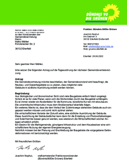 | Antrag der Fraktion BÜNDNIS 90/DIE GRÜNEN vom 28.06.2022 Die Gemeindevertretung möchte beschließen, der Gemeindevorstand wird beauftragt, die Neubau- und Gewerbegebiete so zu planen, dass möglichst viele Gebäude in südliche Ausrichtung erstellt werden können. |