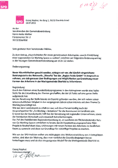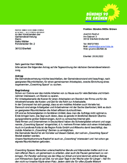 | Antrag der Fraktion BÜNDNIS 90/DIE GRÜNEN vom 28.06.2022 Die Gemeindevertretung möchte beschließen, der Gemeindevorstand wird beauftragt, nach geeigneten Räumlichkeiten für einen gemeinsamen Arbeitsplatz zwecks Einrichtung eines so genannten "Coworking Space" zu suchen. |